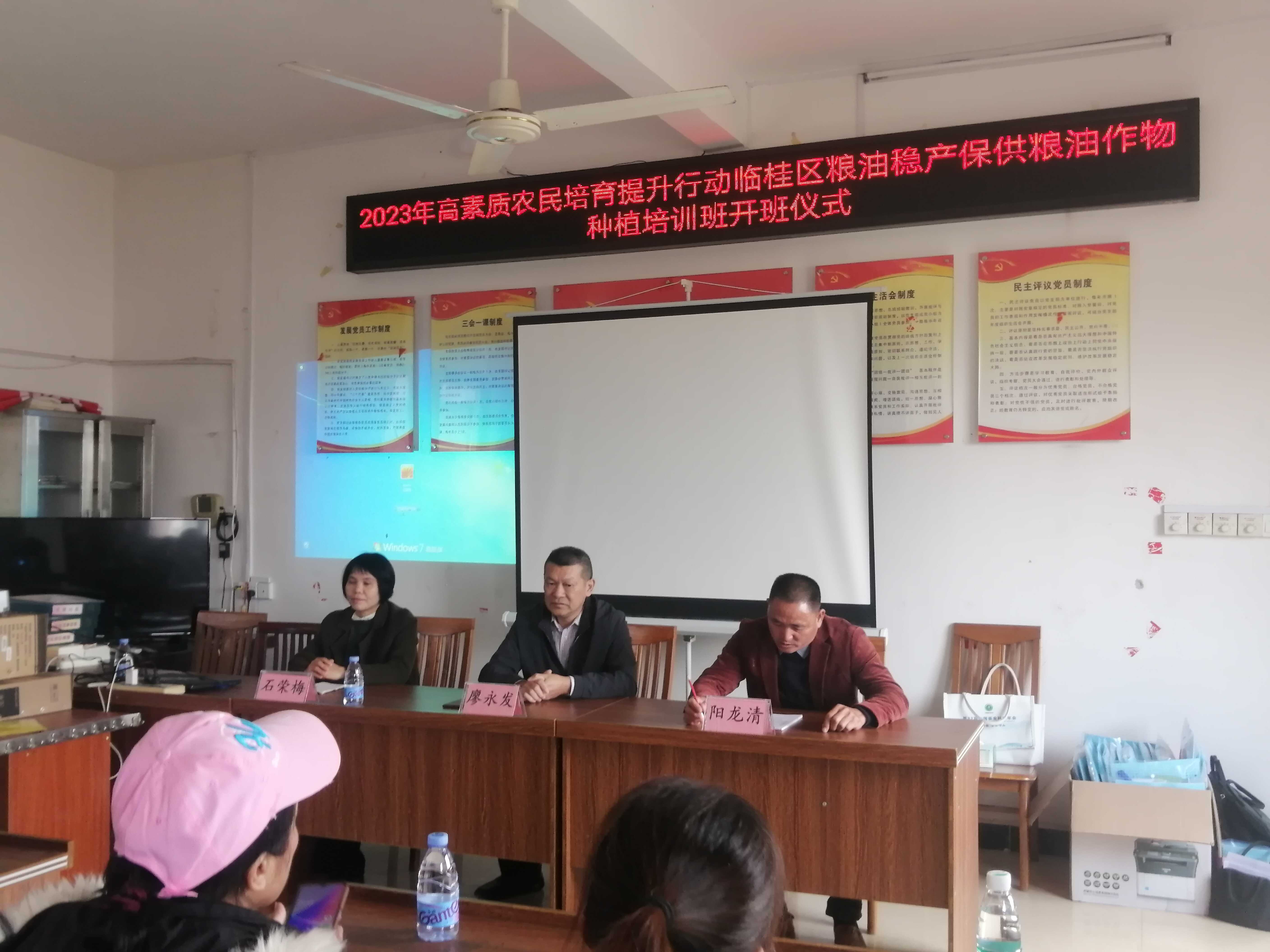 为贯彻落实中央一号文件及全国农业农村工作会议、广西农业农村工作会议精神,按照自治区农业农村厅高素质农民培训计划,由桂林市临桂区农业农村局主办,广西茶叶科学研究所承办的“2023年高素质农民培育提升行动 临桂区粮油稳产保供粮油作物种植培训班”于11月24日在四塘镇大湾村开班。临桂农业农村局领导、广西茶叶科学研究所相关工作人员参加开班仪式。