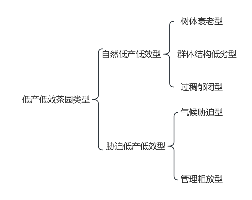 自然低产低效型主要由茶树自身生长状况不良、树势衰退而导致产量下降。