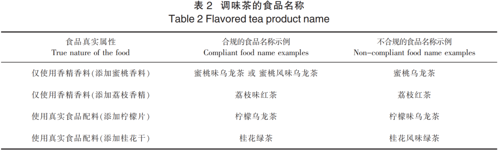 与2009版相比,2025版《管理办法》第十六条(三)新增了一项规定“食品中没有添加某种配料,仅使用食品用香精、香料调配出该配料风味的食品,且在食品名称中体现该配料风味的,应当在名称中冠以‘某味’‘某风味’等字样。”随着消费的多样性,除传统的茶类外,增加了各式香精、香料调配的新式茶饮,不同调味茶的食品名称如表2所示。