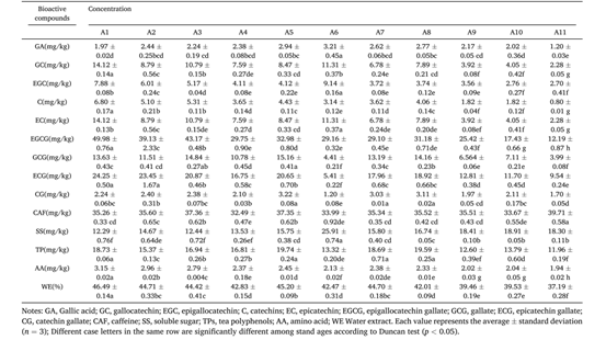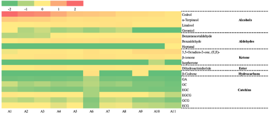 研究发现(表1,图1),六堡茶关键成分随储存时间呈现显著非线性变化。1–3年:表没食子儿茶素没食子酸酯(EGCG)、咖啡碱及青草香物质含量高,滋味苦涩;4–8年:可溶性糖、没食子酸及木质香/甜香类物质逐步积累,口感趋于醇和;9–11年:甜味与醇厚度显著提升(p < 0.01),EGCG降至初始值,而苯甲醛(杏仁香)、香叶醇(花果香)及可溶性糖含量分别提升约1.5倍,感官综合评分达峰值。
