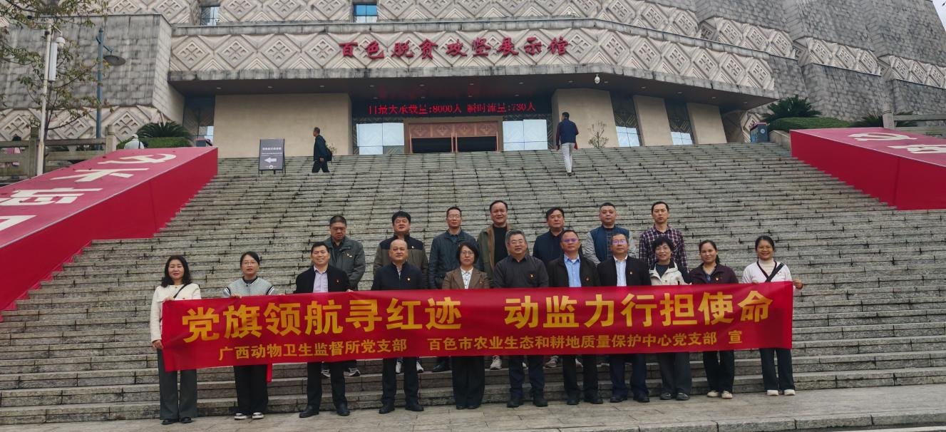 为深化“党旗领航 动监力行”党建品牌建设,传承艰苦奋斗革命精神,切实立足岗位履职担当,主动服务乡村振兴大局,2025年12月18—19日,广西动物卫生监督所党支部与百色市农业生态和耕地质量保护中心党支部联合开展“党旗领航寻红迹 动监力行担使命”主题党日活动,两支部党员及部分业务骨干共20人参加此次活动。