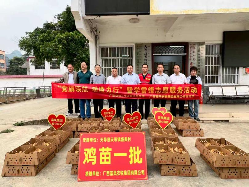 本次活动中,广西动物卫生监督所与富凤集团向盛典村捐赠了3000只优质鸡苗和养殖技术相关书籍,以实际行动践行雷锋精神,助力农户发展庭院经济、拓宽增收渠道。