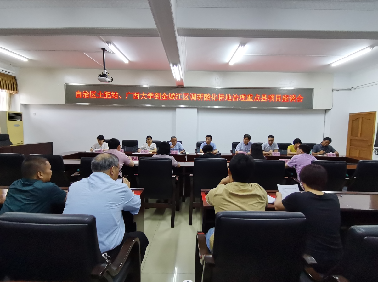 调研组先与河池市土肥站、金城江区人民政府、金城江区农业农村局相关领导和人员召开座谈会,座谈会就金城江区目前酸化耕地治理项目开展情况、下一步计划以及存在困难和问题作了沟通交流。