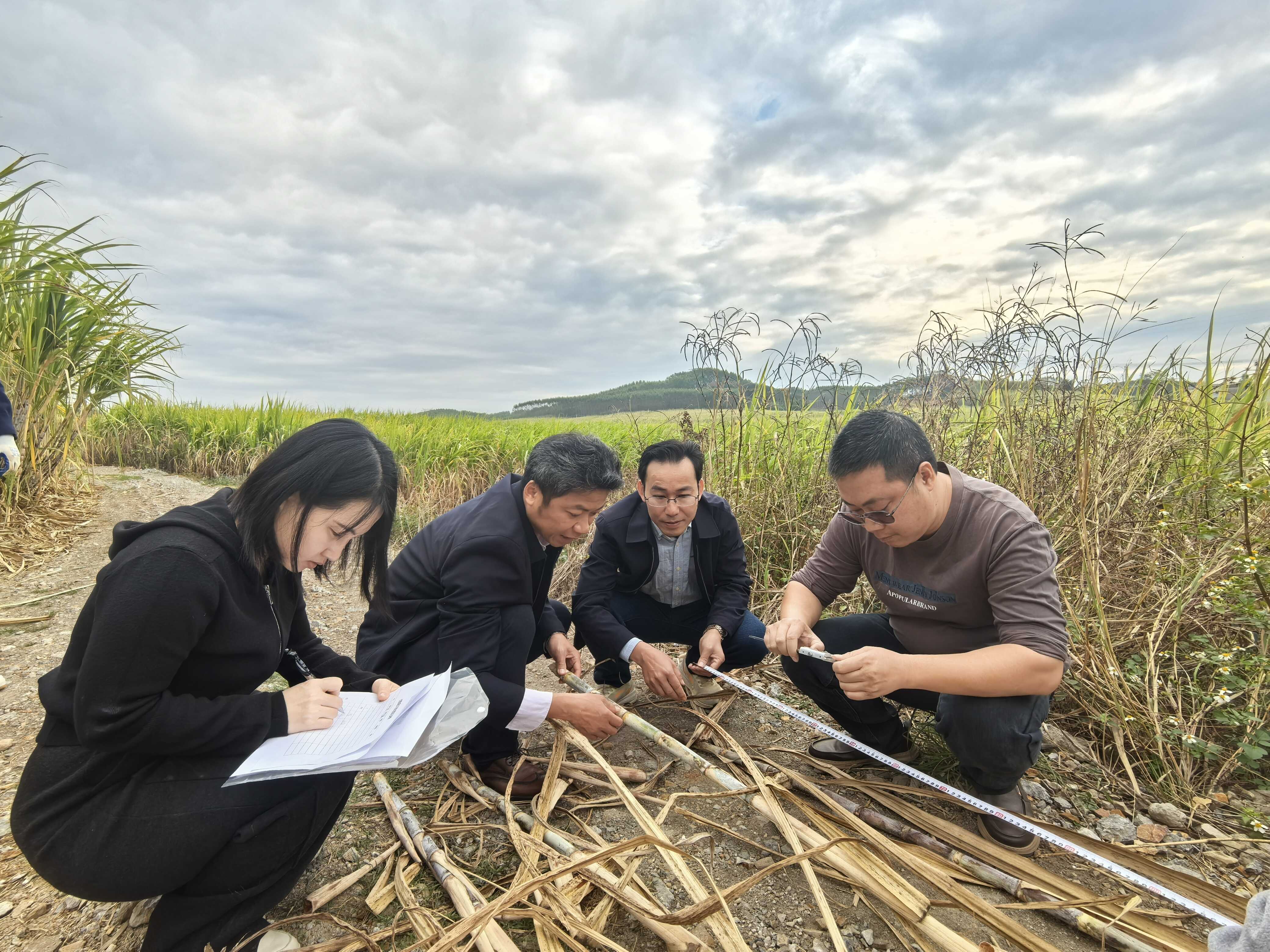 工作组前往鹿寨县鹿寨镇甘蔗试验田,与种植户、基层农技人员一道,对甘蔗株高、茎粗、锤度等生长指标进行现场测量,并对测产验收提出了具体要求。