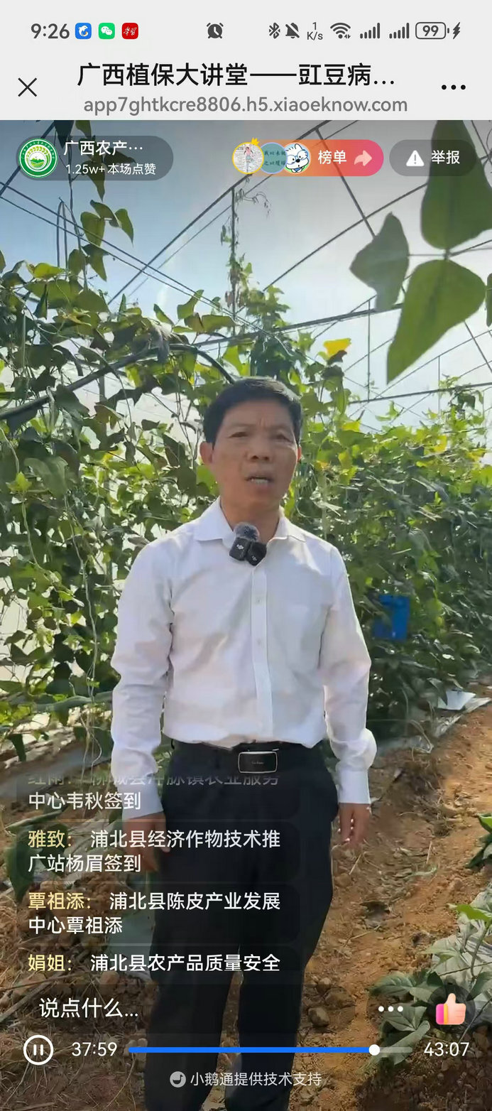 冬春时节,正是八桂大地豇豆产销两旺的黄金期,也是病虫害防控关键时期。为做好冬春豇豆病虫害绿色防控,实现农药减量控残,提高产品质量安全水平,2025年11月14日,自治区植保站联合中国农业大学、中国热带农业科学院等单位,在南宁市青秀区长塘镇豇豆种植基地开展《广西植保大讲堂—豇豆病虫害绿色防控》现场直播课,各级技术推广人员和种植主体通过线上线下方式累计千余人次同步参与学习,获得12532人次点赞。