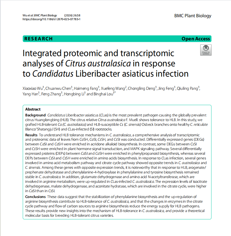 近日,我院柑橘种质创新与利用团队在二区期刊《BMC plant biology》(IF=4.8)发表题为“Integrated proteomic and transcriptomic analyses of Citrus australasica in response to Candidatus Liberibacter asiaticus infection”的研究论文。