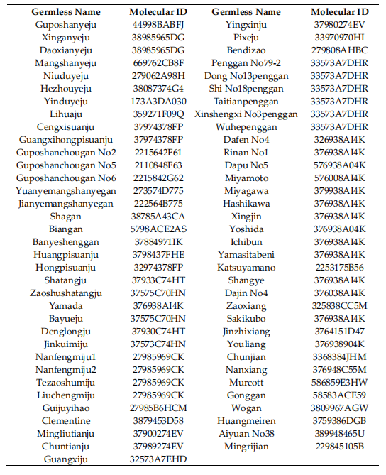 本研究仍存在局限性。未来的工作将针对这些局限性,通过以下方式加以改进:(1)扩大种质资源范围,纳入更多野生和栽培宽皮柑橘种质,建立全面的分子身份证数据库;(2)整合先进技术(如转座子展示、靶向SSR测序和全基因组测序),提高对芽变品种的区分能力;(3)在多环境、多年度的试验中对已开发的分子身份证进行验证,以增强其在品种实际鉴定中的可靠性;(4)将分子身份证与表型性状相结合,解决柑橘命名冲突问题,并厘清遗传关系。这些努力将推动宽皮柑橘种质资源管理,支持知识产权保护,并促进柑橘产业的可持续发展。