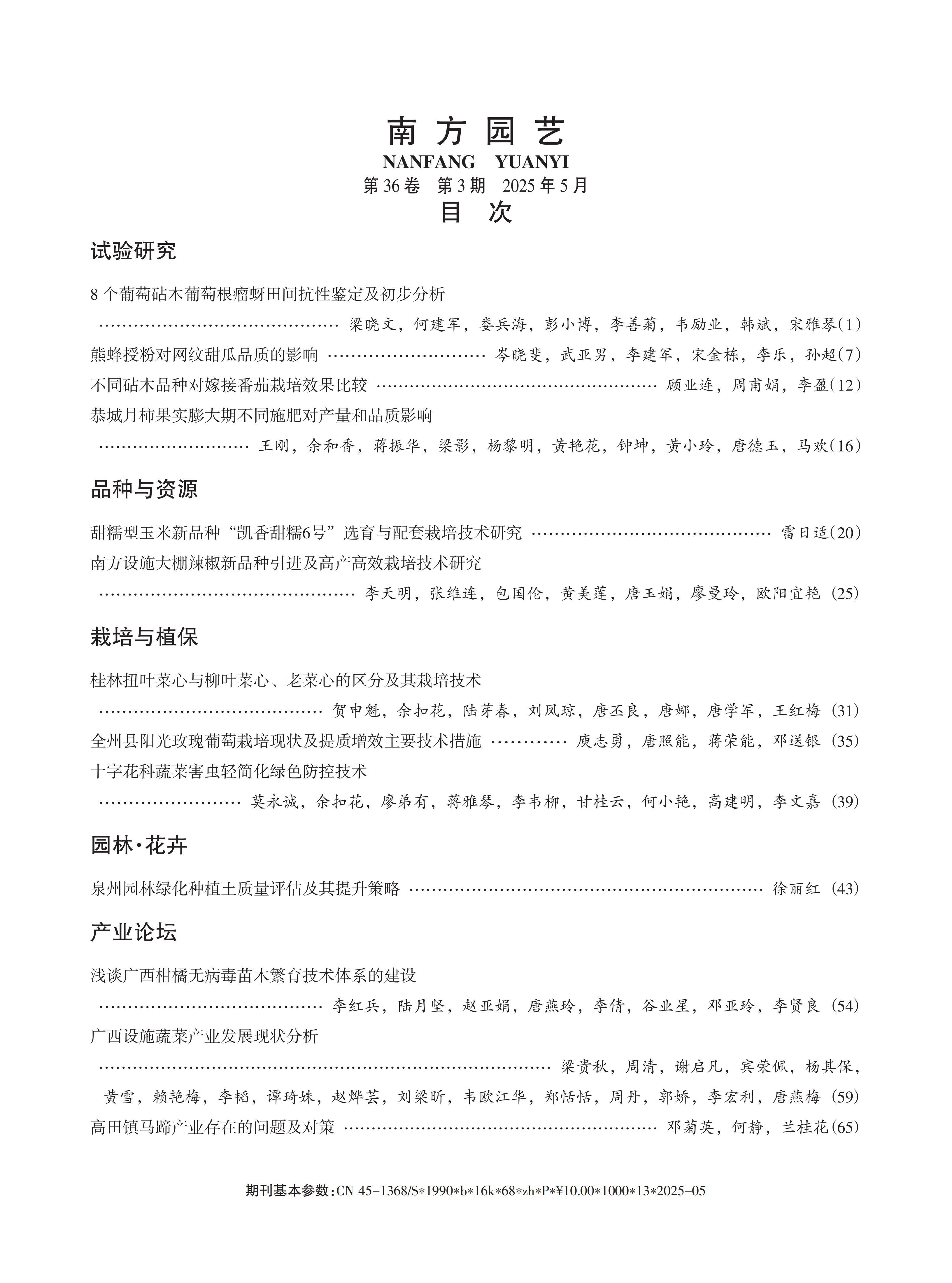 《南方园艺》2025年第3期中英文目录