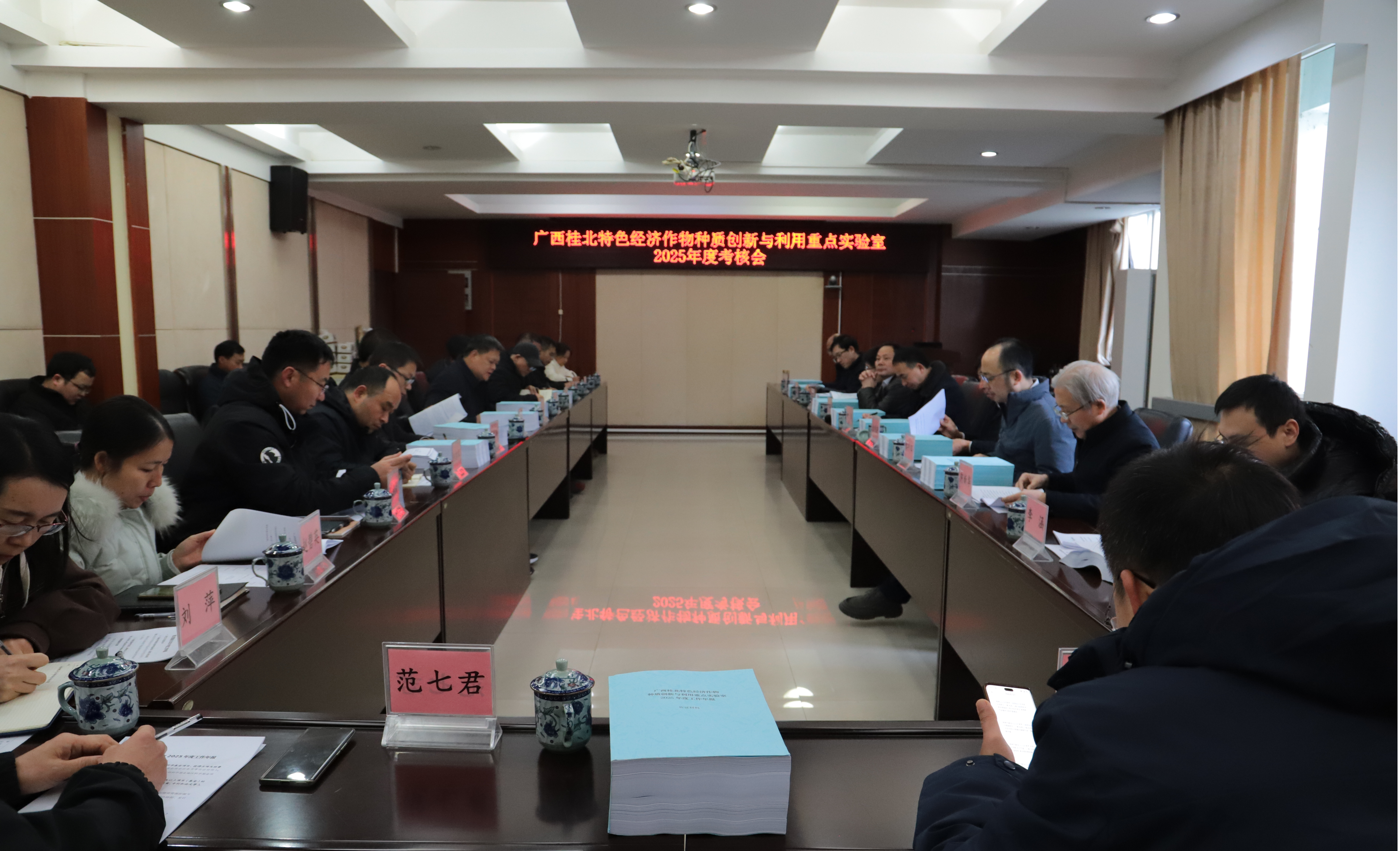 2026年1月7日,广西桂北特色经济作物种质创新与利用重点实验室2025年度考核会在广西特色作物研究院召开。来自四川省农业科学院、广西农业科学院、华中农业大学、南京农业大学、北京林业大学、西南大学、广西大学、广西师范大学和中国科学院广西植物研究所的9位专家及我院学术带头人、团队负责人等36人参加会议。