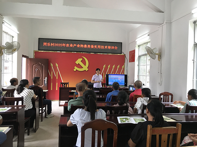 在隆安县都结乡同乐村,科技特派员紧扣当地的气候特点和生产实际,围绕桑树种植与病虫害防治、大蚕饲养关键技术、蚕病科学防控技术等蚕桑生产核心内容展开技术培训,通过拆解难点要点技术知识、播放典型视频图片、发放技术手册等方式,让复杂的技术知识变得通俗易懂,蚕农易于掌握。在培训互动环节,蚕农们争相提问,特派员一一解答,现场气氛热烈。同乐村民李大哥说道:“通过这次培训我们学到了很多蚕桑生产实用技术,也发现了不足,例如养蚕要用新鲜石灰并且密封保存,发现弱小蚕、病蚕要及时淘汰并严格处理.....”