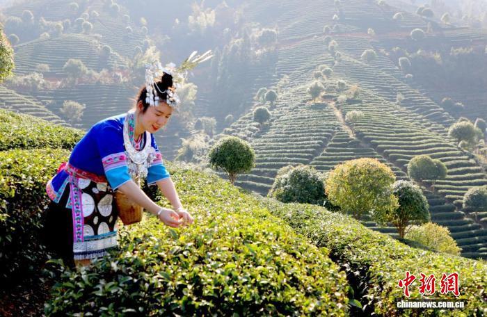图为广西三江生态种植茶基地姑娘正在采茶。邓蕾雅 摄