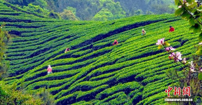 图为广西贺州昭平县高山生态茶园采春茶。喻湘泉 摄