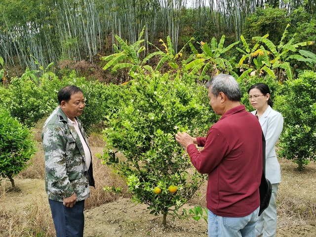 技术员在果园对李安洲(左一)进行柑果种植技术指导