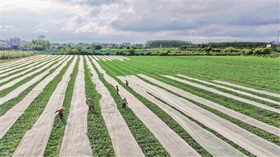 9月25日,合浦县廉州镇中站村的秋西瓜种植基地里,村民正抓紧在台风过后掀开覆盖在瓜苗上的薄膜,确保植株获得充足的阳光与水分,为接下来的生长创造良好条件。