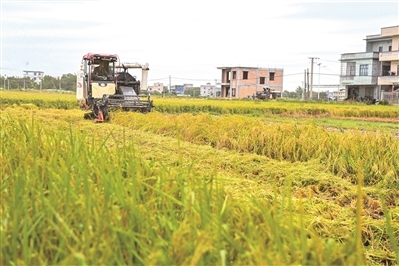 10月22日,合浦县党江镇亚桥村的高标准农田里,收割机来回穿梭收割水稻。