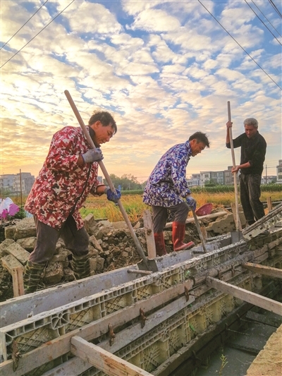 近日,在合浦县党江镇九坡村,施工人员抢抓晴好天气修建农田水沟排渠,田间地头一派忙碌景象。
