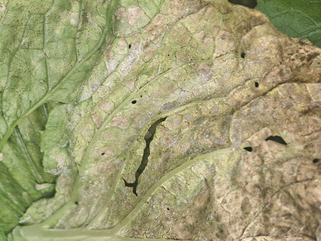6、霜霉病:主要为害莴苣属和十字花科蔬菜,病株率一般为1.5~3.5%,病叶率高的为达11.9%。