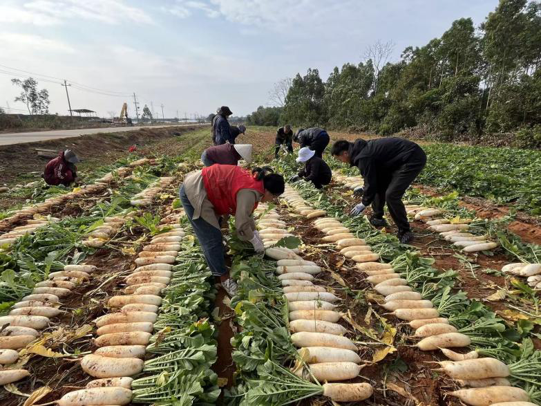 在银海区朝辉合作社的萝卜田里,志愿者们身着志愿服、佩戴党徽,在合作社工作人员的引导下,大家分工协作开展萝卜采收、去缨分拣、搬运装车工作。党员干部们不顾泥土沾衣,弯腰劳作、手脚麻利,精准完成各项采收流程。劳作间隙,技术骨干还与农户深入交流萝卜种植管理经验,分享科学采收技巧。年轻党员干部们,认真聆听、积极提问,在实践中学习到不少农业专业知识,这不仅提升了志愿服务实效,也为推广科学种植方法,提升农产品质量奠定基础,同时,也解决合作社农忙时节劳动力短缺等生产难题。