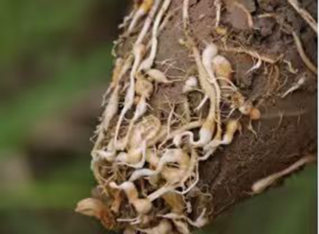 3.水稻根结线虫病是通过根结线虫幼虫入侵水稻根部进行危害,诱导形成大小不一的根瘤。随着病情发展,根瘤从乳白色变为褐色、腐烂,破坏植株根系;根系被破坏后影响养分水分吸收,出现叶片黄化、植株矮小、分蘖减少、僵苗、甚至早枯等症状。目前已在部分田块发生,发病田块注意及时防治。