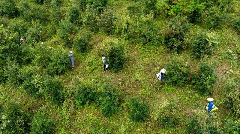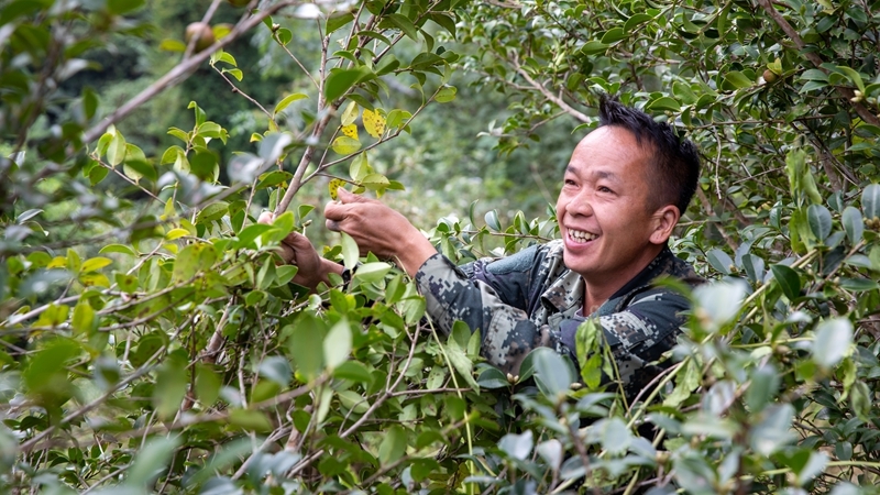 油茶基地里村民三两成群穿梭在油茶林间采摘。赵文朝 摄