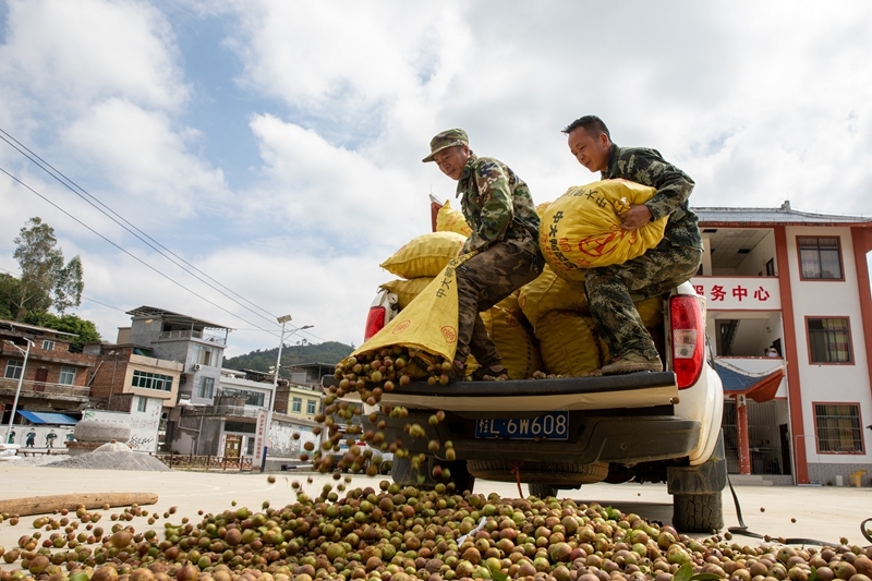 10月23日,八中村村民把从山上采摘回来的油茶果运回村部晾晒。赵文朝 摄