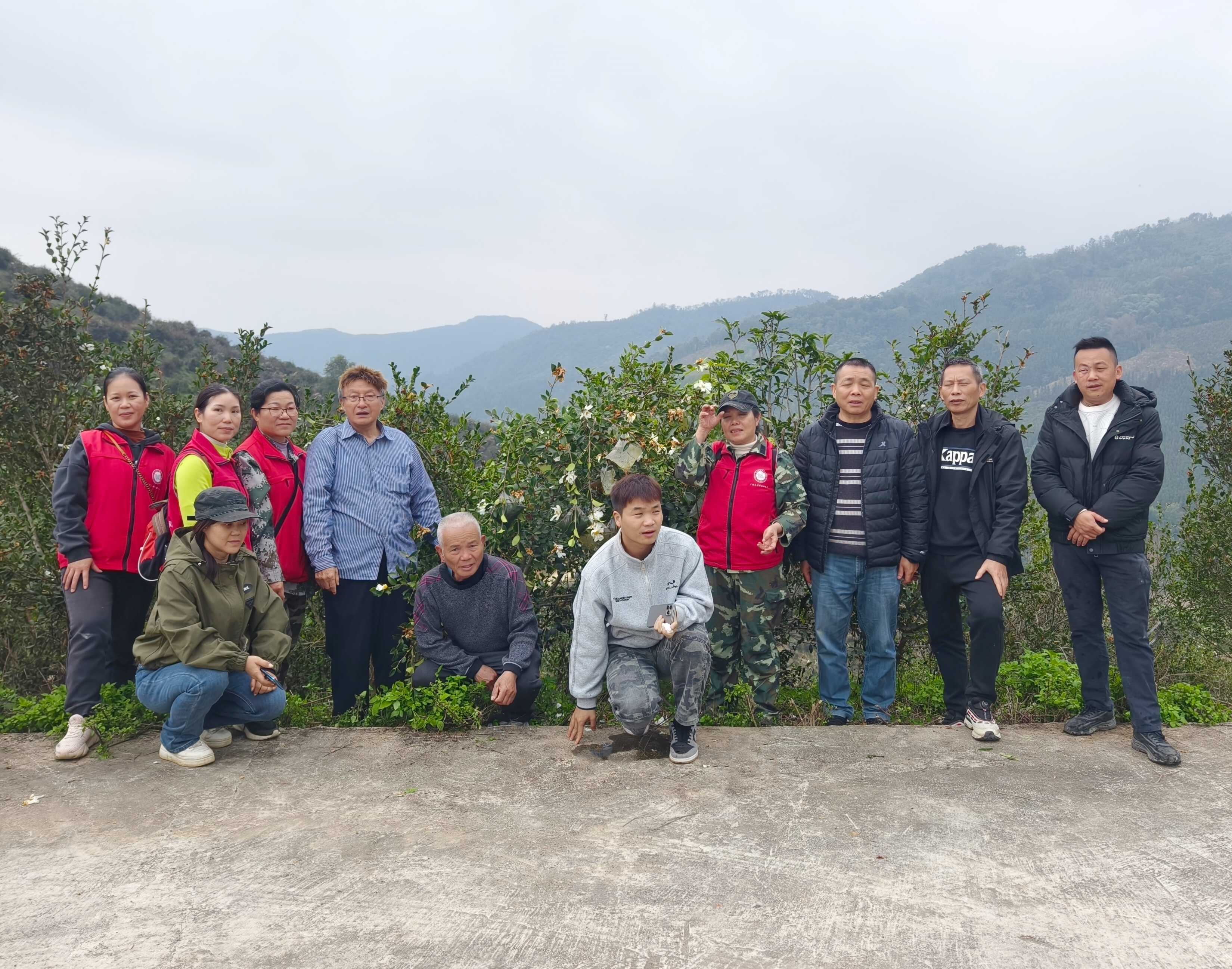 (图为12月30日下午,科技特派员到者苗乡者苗村各怀屯,鑫福源油茶产业示范区管理中心对国家乡村振兴重点帮扶县广西田林团油茶产业组实施的 2024-2025 年油茶低产林改造(无人机辅助授粉 + 植保)项目开展验收,图为验收组成员现场合影。 摄:钟晖)