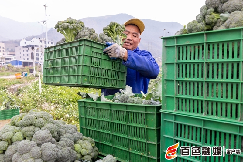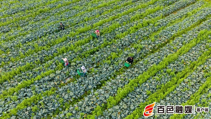 2月6日早上,位于田林县利周瑶族乡百达村的大鹏生态农业蔬菜基地的工人们正抢抓晴好天气采摘西兰苔,为春节市场添上一份生态好味。