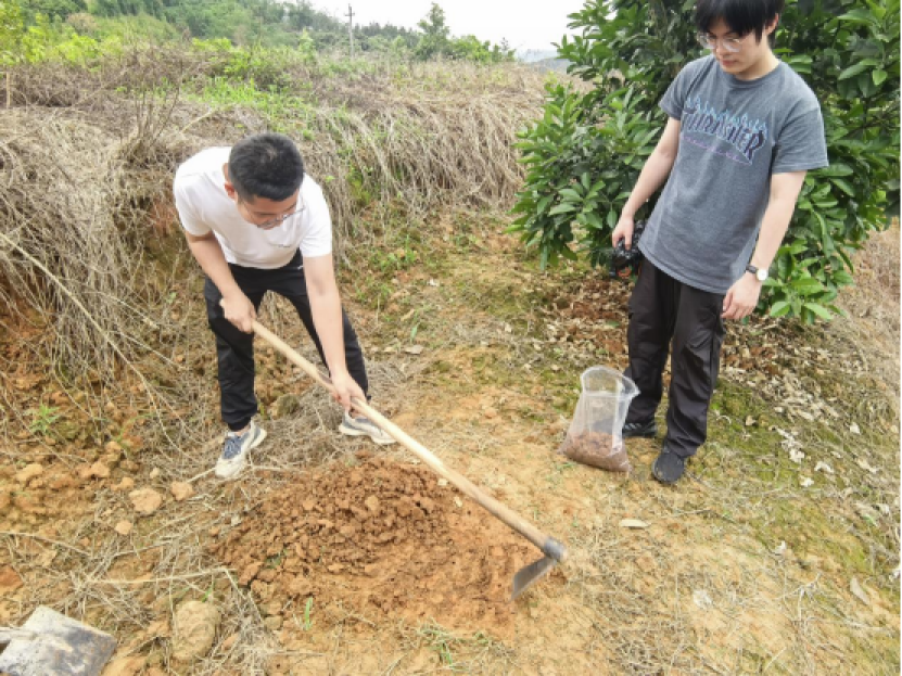 图为技术人员在田林县六隆镇小榄村橘红种植基地开展土壤采样。