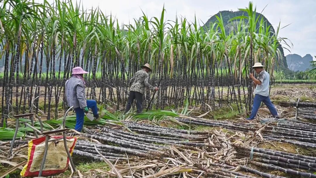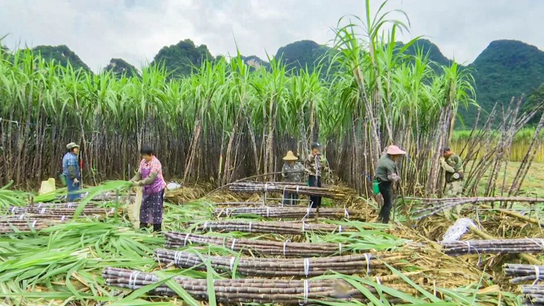 而在大新县雷平镇后益村岜伏屯,当地的黑皮果蔗也迎来了丰收,村民正在甘蔗田里忙活着,他们分工合作,砍蔗、整理、捆扎成束、装车,一派喜人的丰收景象。