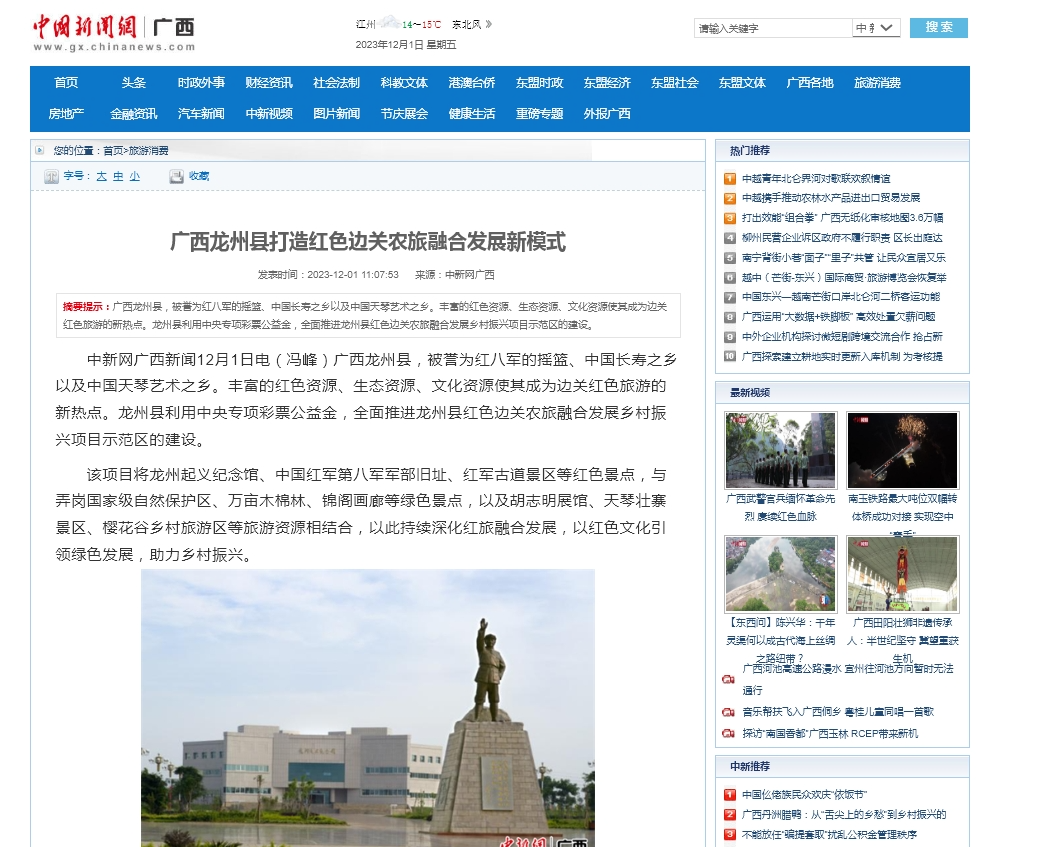 12月1日,中国新闻网推发文章《广西龙州县打造红色边关农旅融合发展新模式》,报道龙州县全面推进红色边关农旅融合发展乡村振兴项目示范区建设,以红色文化引领绿色发展,助力乡村振兴。