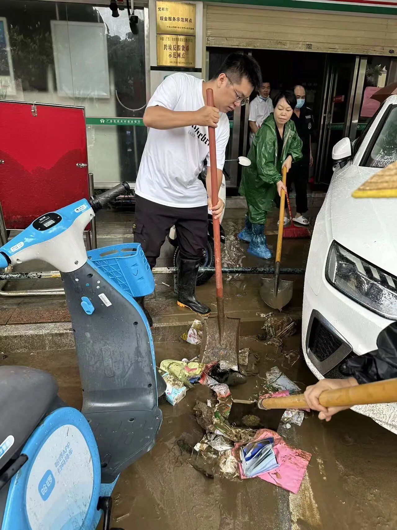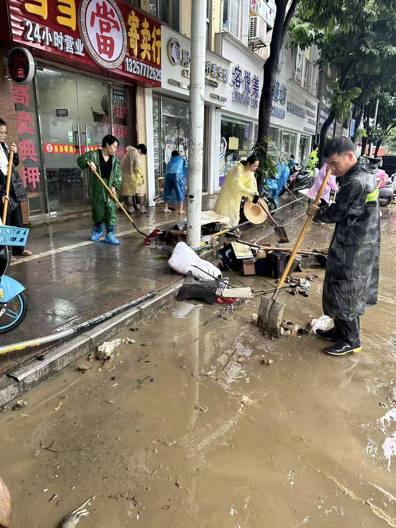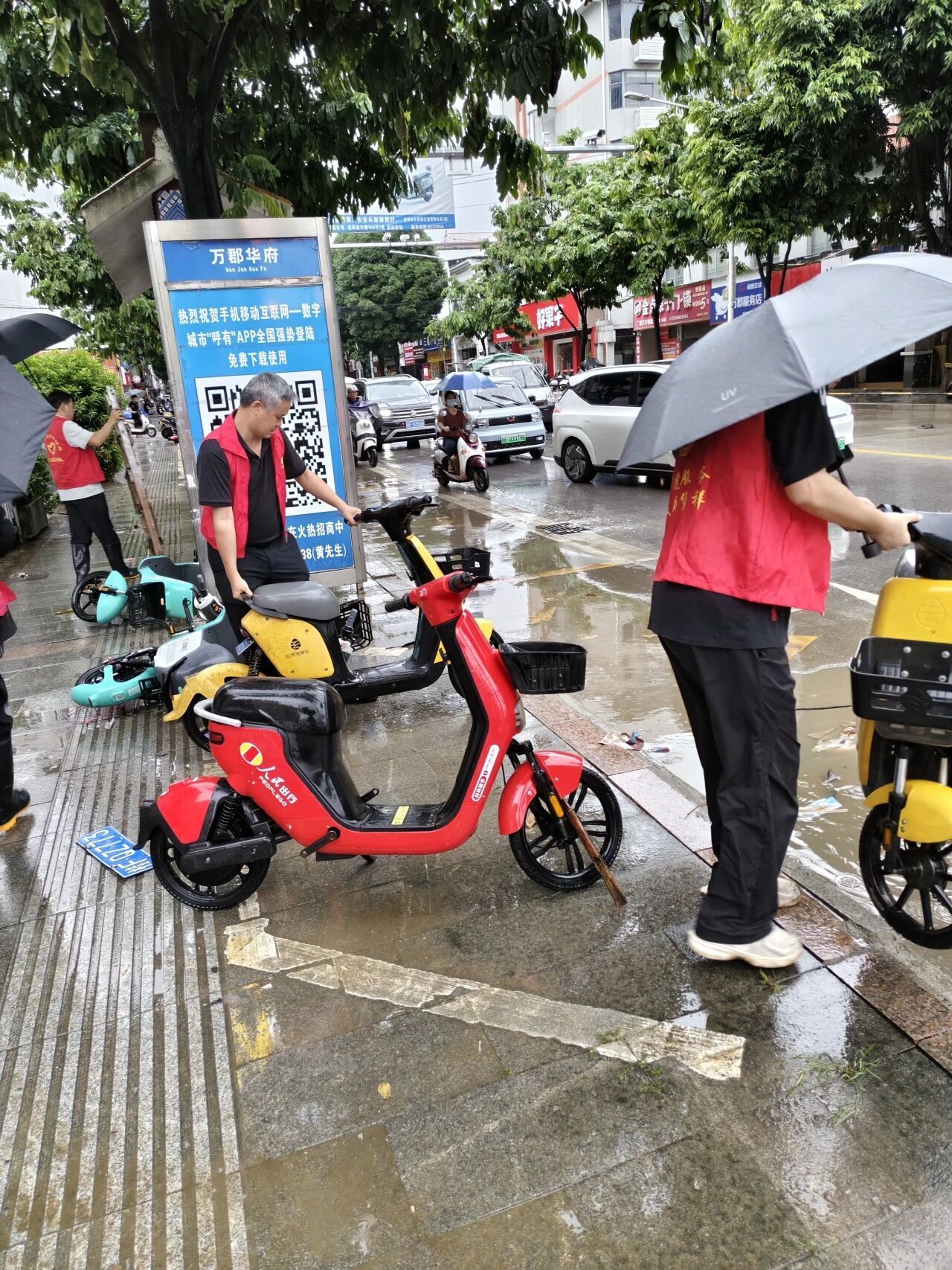 受强降雨影响,我局周边店铺及停放车辆遭受洪水浸泡。30日早上水位退去后,我局迅速组织18名党员和62名干部组成2支“志愿服务队”,并由党员任组长,第一时间奔赴现场,协助居民群众恢复生产生活秩序。在现场,身着红色志愿马甲的队员们分工协作、有条不紊地开展工作,协助清理道路两侧淤泥和积水,并协助20余家店铺清理因洪水浸泡损坏的物品,搬运规整电动车及小黄车100多辆,拾还车牌2块。