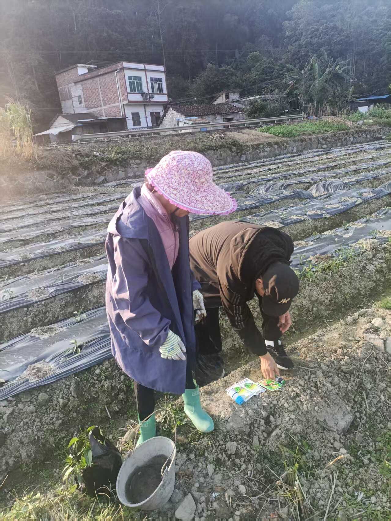 上图为许日聪高级农艺师(右一)正在指导农民使用叶面肥喷施辣椒苗防寒防冻