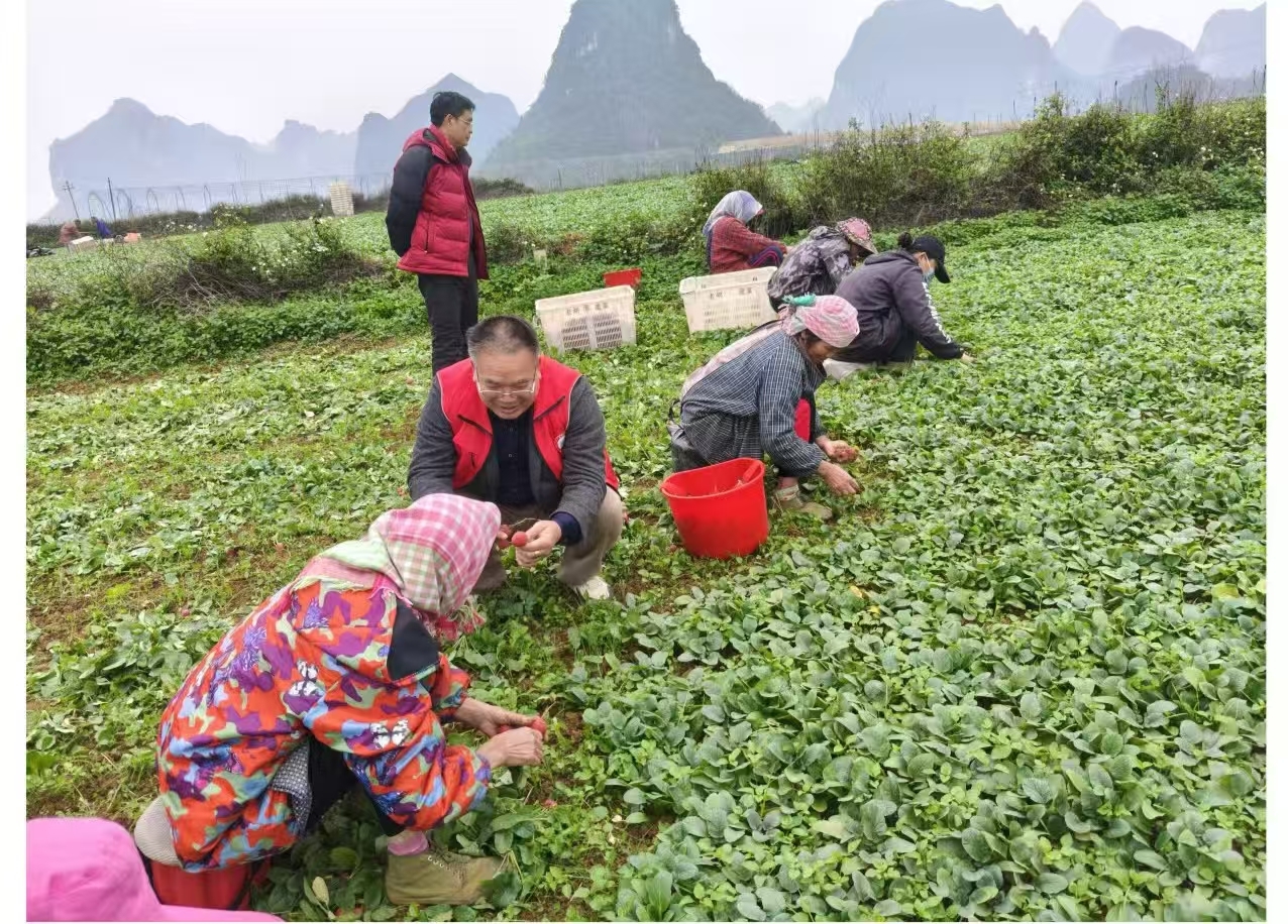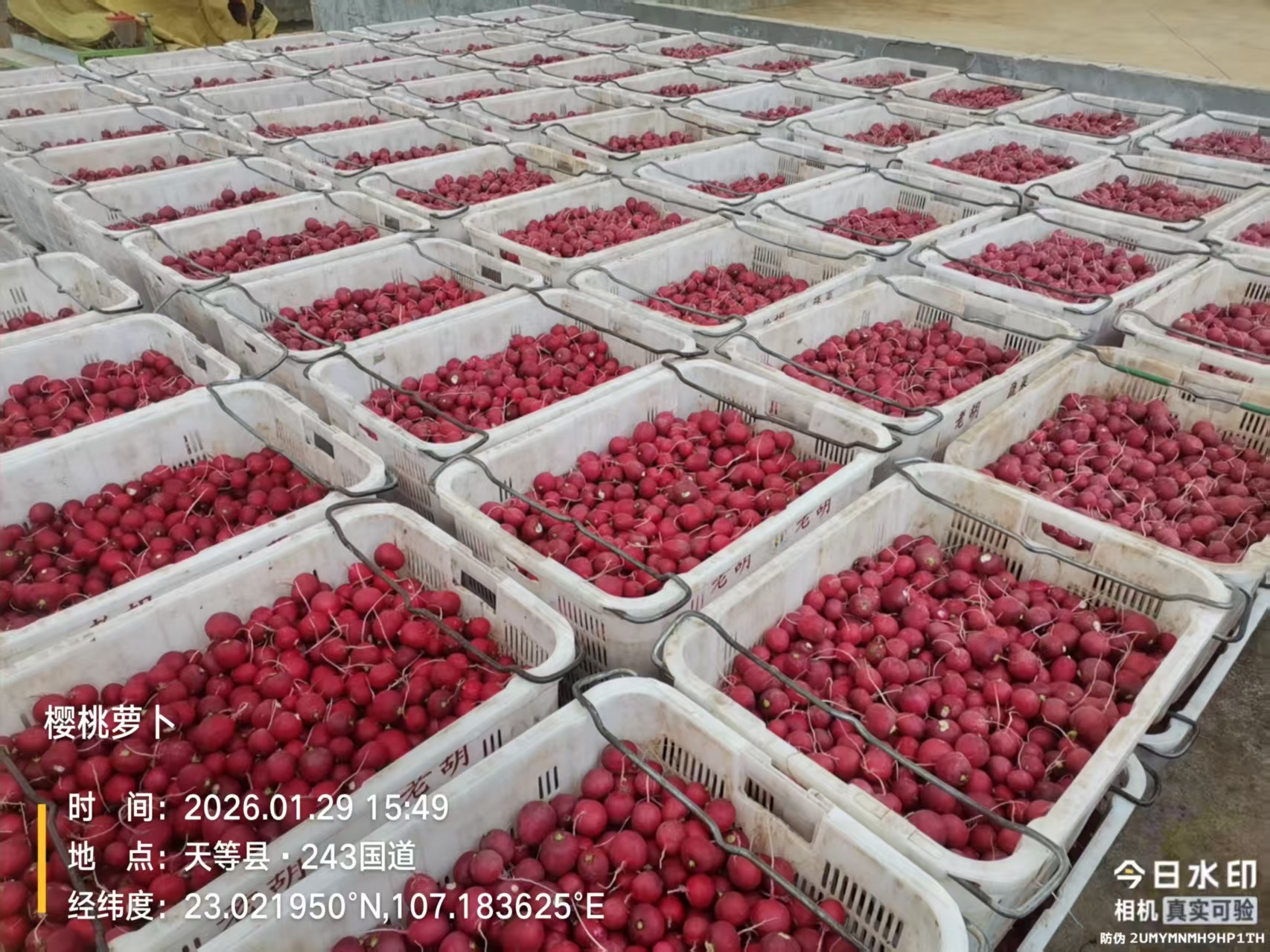 2026年1月29日,天等县天等镇母村水肥一体化设施蔬菜示范基地迎来樱桃萝卜采收。基地组织当地70余名劳动力参与采收,田间一派繁忙有序景象。经现场测产,该批樱桃萝卜亩产突破4000斤,按订单收购价测算,亩产值预计可达万元。