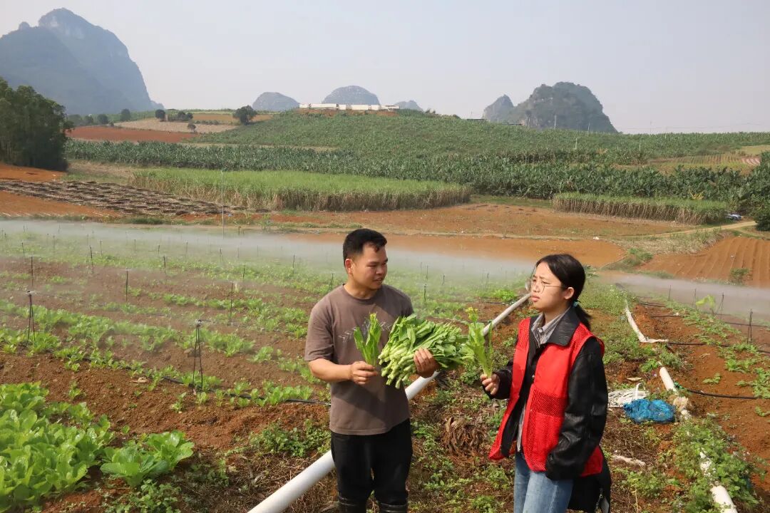 科技赋能,让蔬菜种植更高效、更绿色。基地工作人员阙祖东一边打开蔬菜基地的雾喷系统一边介绍:“基地本季主要种植白菜苔、紫菜苔、萝卜等品种,蔬菜采收后主要销往广东、南宁等地,预计一年总收入可达200多万元。”这套喷雾系统利用太阳能供电,实现了节水均匀、增湿防病。他指着眼前的菜地表示,通过“猪—鸡—鸭—鱼—菜”立体循环模式,将畜禽粪污转化为鱼食,鱼塘的尾水则变成灌溉的“肥水”,实现了养殖不排污、种植少用肥的绿色生产,真正实现了生态效益与经济效益的双赢。