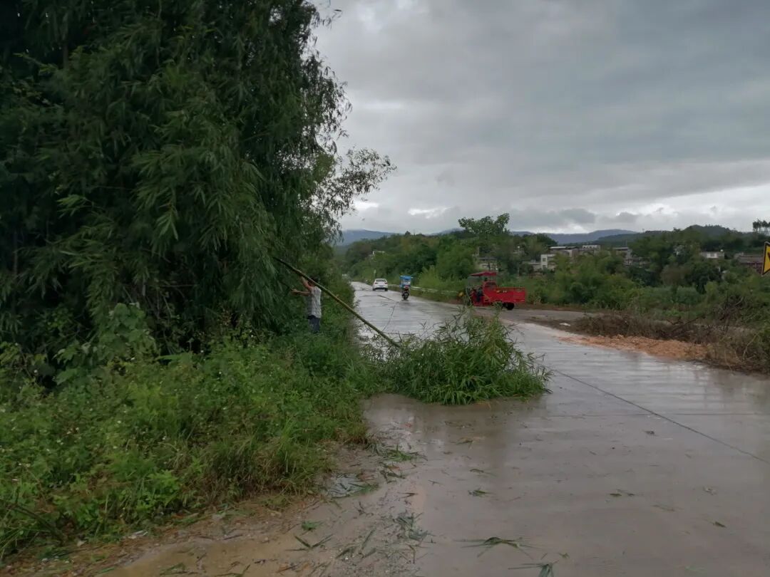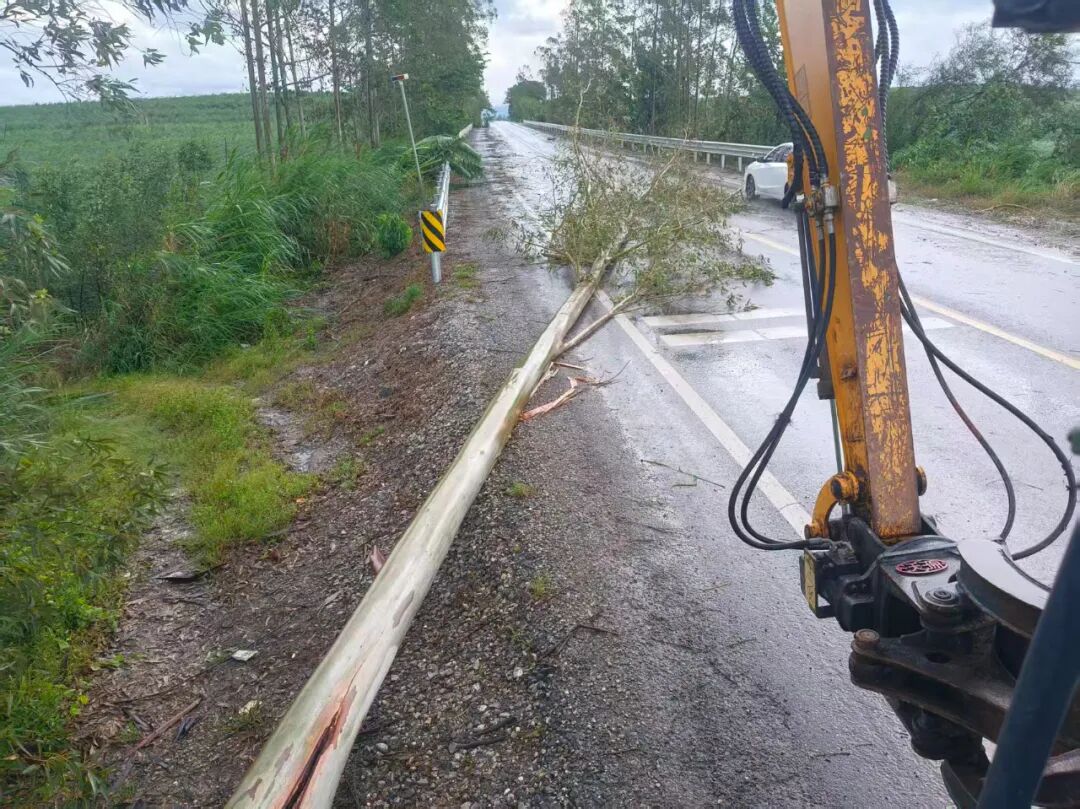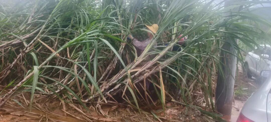 10月7日,风势雨势减弱后应急组立即转变为灾后恢复工作队,展开全域抢险救灾行动。在甘蔗种植核心区,采取“分类施救”的策略对轻微倒伏的甘蔗,用绳索固定扶正,减少茎秆折断;对积水严重的地块,架设抽水泵强排积水,防止根部霉变。同时,农技员现场开设“田间课堂”,手把手教农户做好灾后甘蔗消毒、培土等管护,降低二次损失。在交通要道沿线,清障组队员们用油锯切割倒伏树木,用铁锹清理路面淤泥,还用半天时间抢通3条中断乡村路。在受淹农田区,队员们带着铁锹、水泵、绳索等工具奔赴受灾较严重的田间地头,打响秋收农作物保卫战。