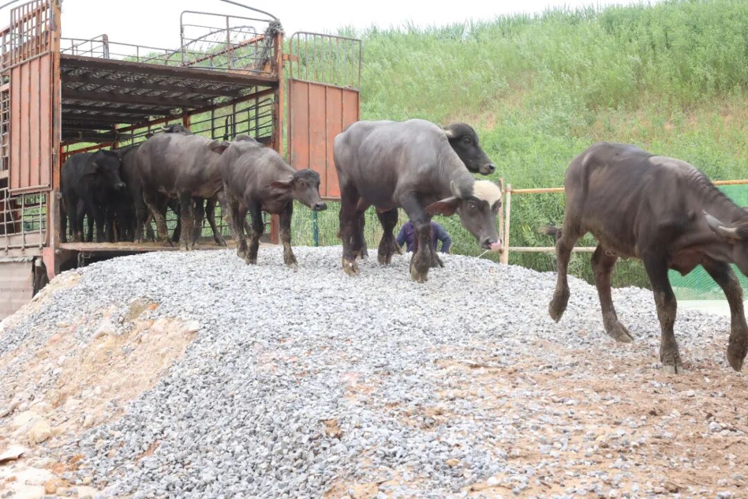 伴随着车厢门开启,良种水牛在基地饲养员引导下,一头跟着一头从卸牛台稳步踏入它们的“新家”,饲养员则细心观察每头水牛的状况,并根据每头牛的体型大小分养至不同的牛舍,以便更好地进行管理饲养。