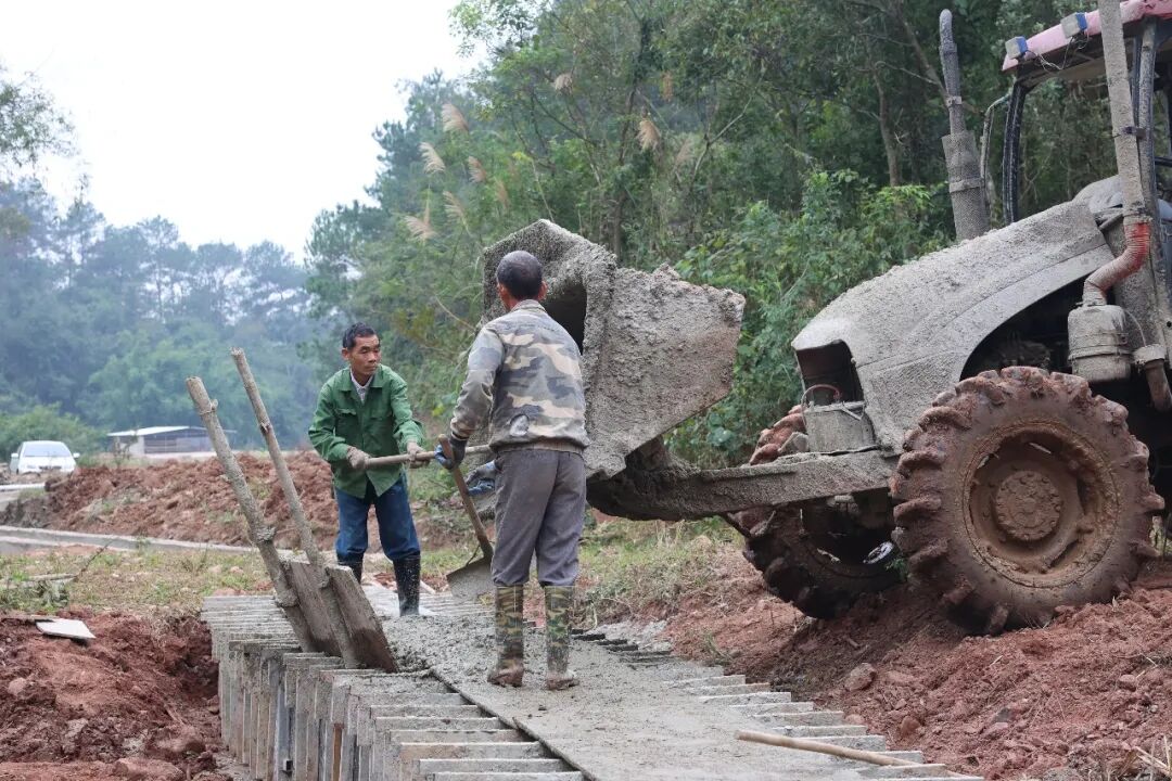 在另一侧施工现场,有的工人正在用挖掘机平整水渠渠基,有的工人则正在筑模、灌浆。驻村工作队队员们则在施工现场检查工作进度,与施工队沟通灌溉水渠的修建细节。