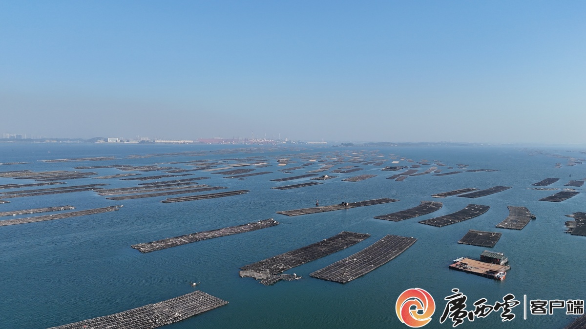 防城港市光坡镇潭油村海岸线上,一片片规划整齐的养殖网箱与连绵的蚝排。记者 杨康 摄