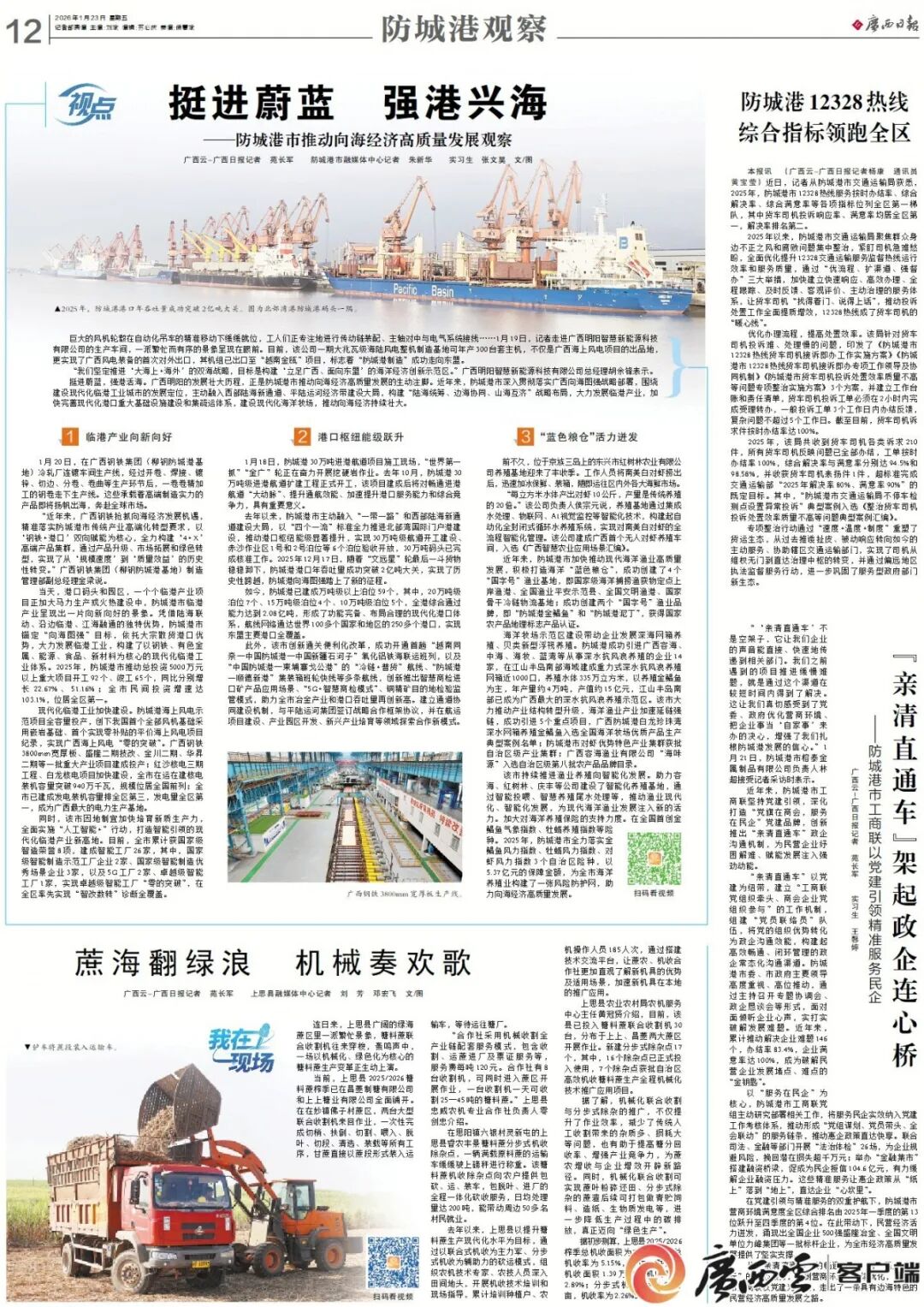 当天,港口码头和园区,一个个临港产业项目正加大马力生产或火热建设中,防城港市临港产业呈现出一片向新向好的景象。凭借陆海联动、沿边临港、江海融通的独特优势,防城港市锚定“向海图强”目标,依托大宗散货港口优势,大力发展临港工业,构建了以钢铁、有色金属、能源、食品、新材料为核心的现代化临港工业体系。2025年,防城港市推动总投资5000万元以上重大项目开工92个、竣工65个,同比分别增长22.67%、51.16%;全市民间投资增速达103.1%,位居全区第一。