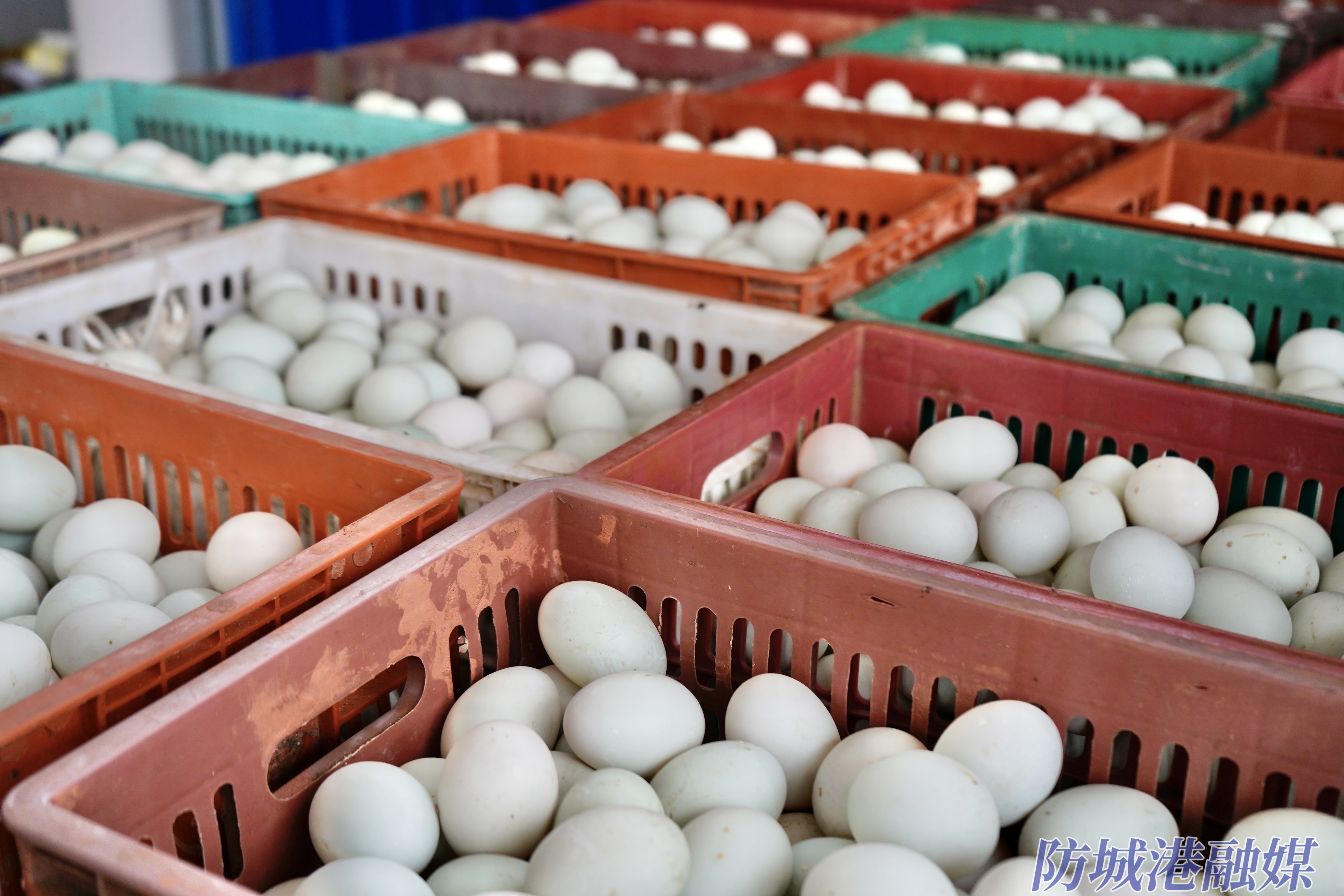 一筐筐鸭蛋整齐摆放,等待装车发运。