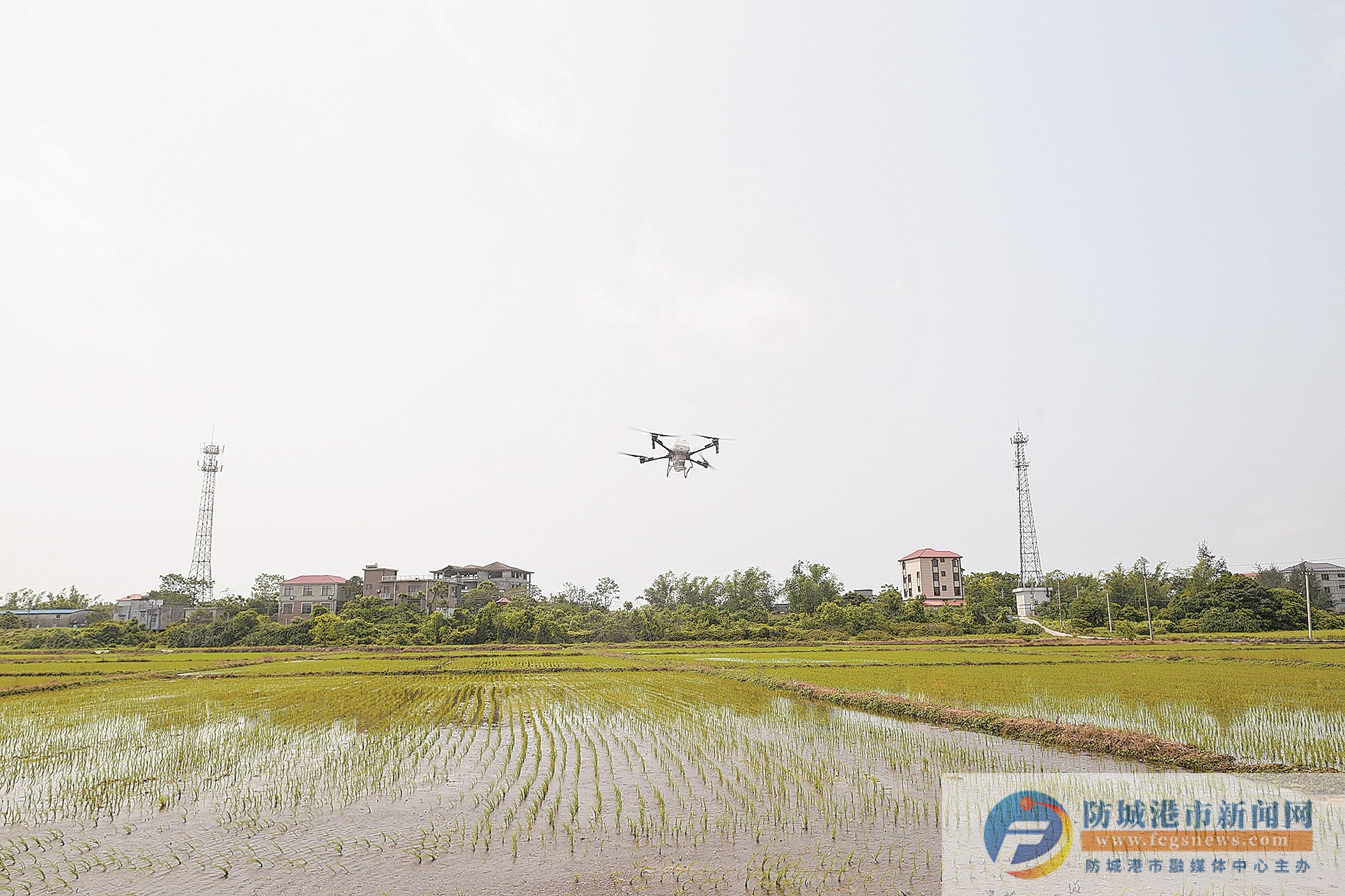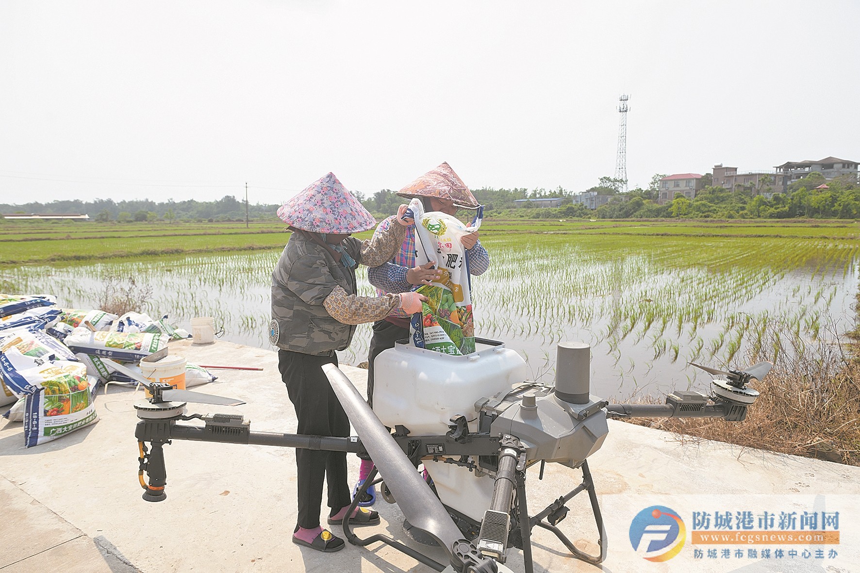 春日融融,农事正忙。近日,记者来到东兴市东兴镇竹山村福珍水稻种植基地,一架植保无人机缓缓升空,在连片水田上空灵活穿梭,细密的复合肥颗粒从机身下方均匀洒落,精准覆盖每一块稻田,为水稻幼苗生长“加餐”。无人机落地间隙,3名工人分工协作、动作娴熟,有序将复合肥装入无人机的播撒器,为下一轮作业做好准备,整个流程高效有序。