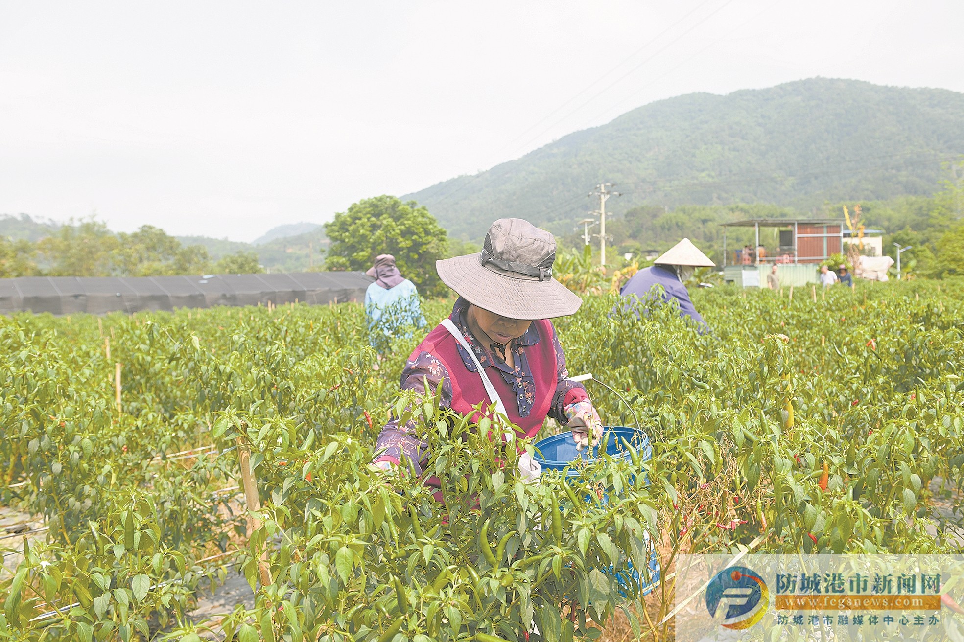 4月9日,记者走进防城区那良镇板蒙村辣椒种植项目基地,眼前一派热火朝天的劳作景象。数名村民穿梭在翠绿的辣椒藤蔓间,指尖灵活翻飞,一个个饱满厚实的辣椒被源源不断地放入塑料桶中,欢声笑语间,满是丰收的喜悦与对美好生活的期盼。