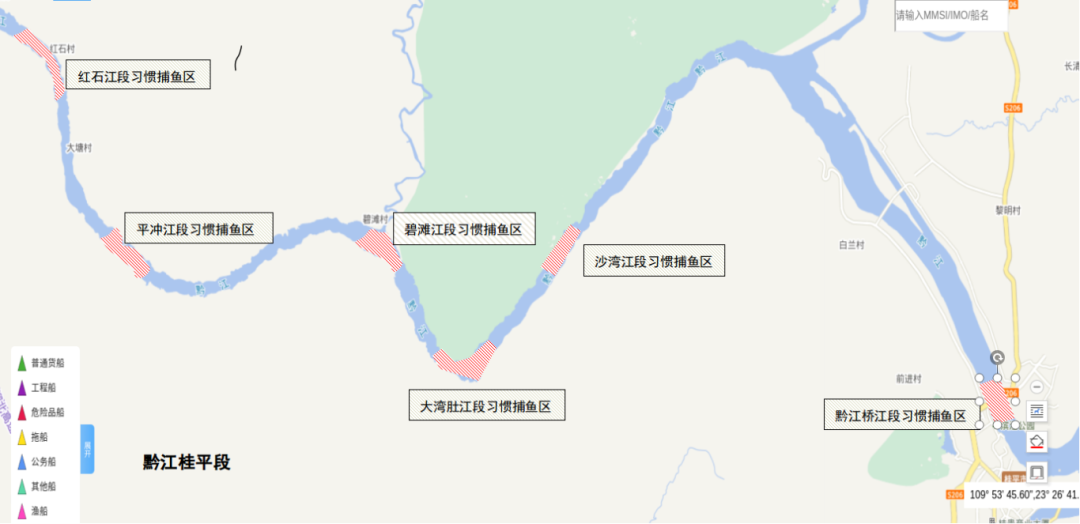 黔江:捕捞时间3-7时,地点:红石江段,平冲江段,碧滩江段,大湾肚江段,沙湾江段,桂平黔江大桥上下江段(如图4所示)