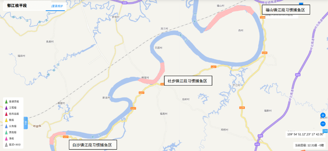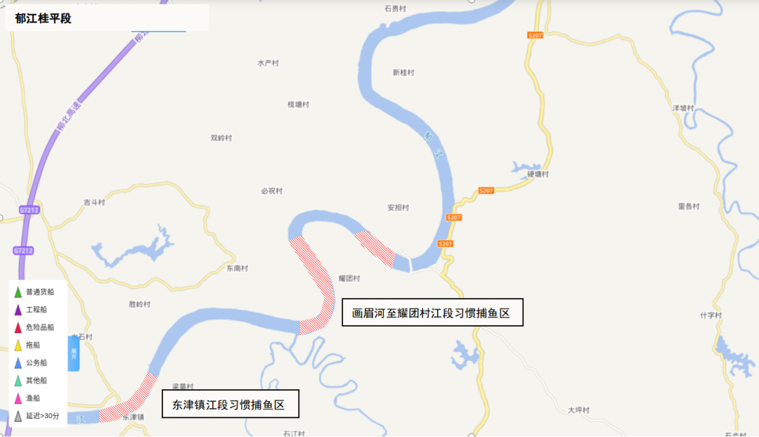 浔江:时间3-7时,地点:东塔至石咀镇江段,牛儿岭江段,牛屎湾江段,江口镇上下江段,盘石江段,木圭镇上下江段(如图7所示)