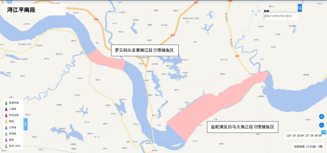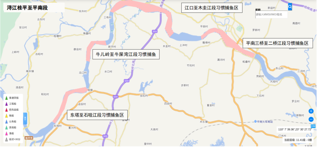 平南县主要捕鱼水域有相思洲尾、三桥至二桥、大成圩边、寨脚至罗云码头、盐蛇滩至龙石面、白马大角,以上也是商渔碰撞防范重点区域。作业时间3-7时、16-19时;经常作业渔船数量丹竹镇5艘,武林7艘,平南街道8艘(如图8所示)