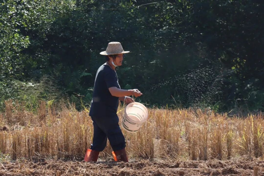 在新政村冬小麦种植基地连片的麦田里,村民们手捧麦种和肥料在田间挥洒,为田地播种冬小麦。覆土机也在播撒麦种的田地间有序运转,为麦苗生长创造条件。