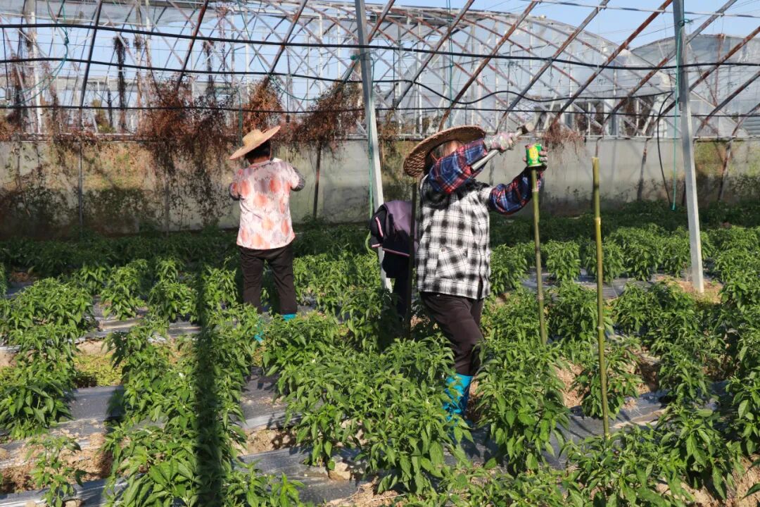 在基地的田间地头,十余位村民正忙着进行辣椒苗固定作业:他们将修整好的竹子按照每隔2.5米的间距插入泥土,再用布条把长势旺盛的辣椒苗固定好。这样做既能保证辣椒苗在适宜的生长空间里充分吸收阳光和养分,又能有效抵御大风天气可能造成的倒伏风险。