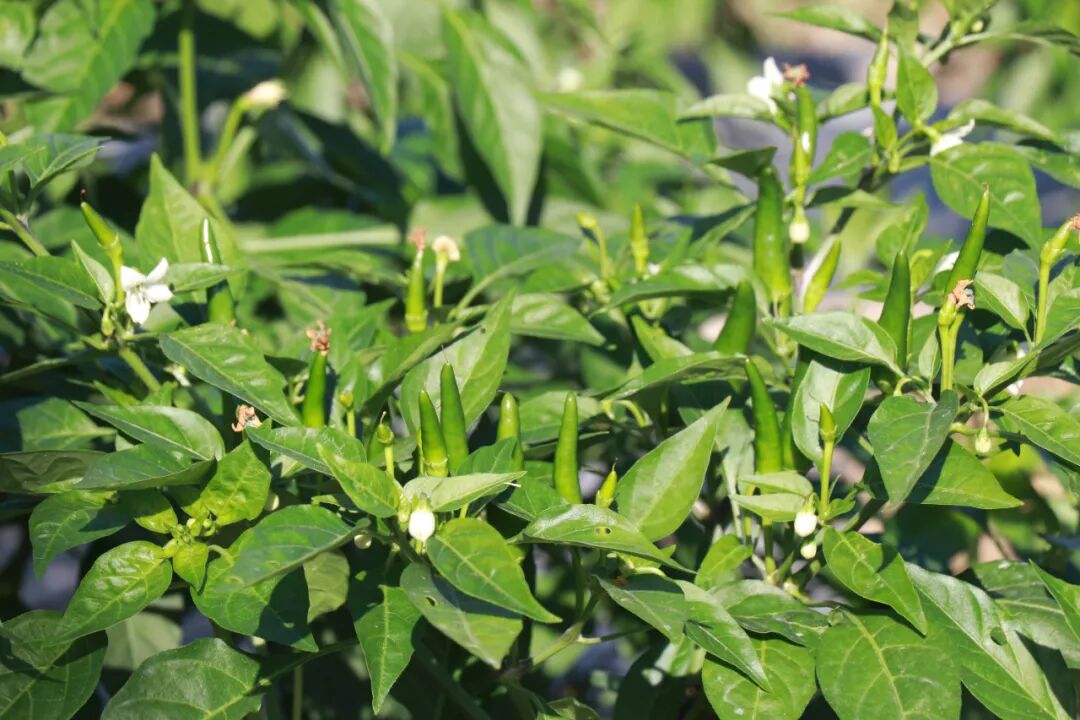 眼下,平南县大新镇古拥村的工业辣椒种植基地里一派生机勃勃的景象。翠绿的辣椒长势茁壮,整齐排列在田垄间,肥厚的叶片间依稀可见白色的花朵与翠绿的果实。