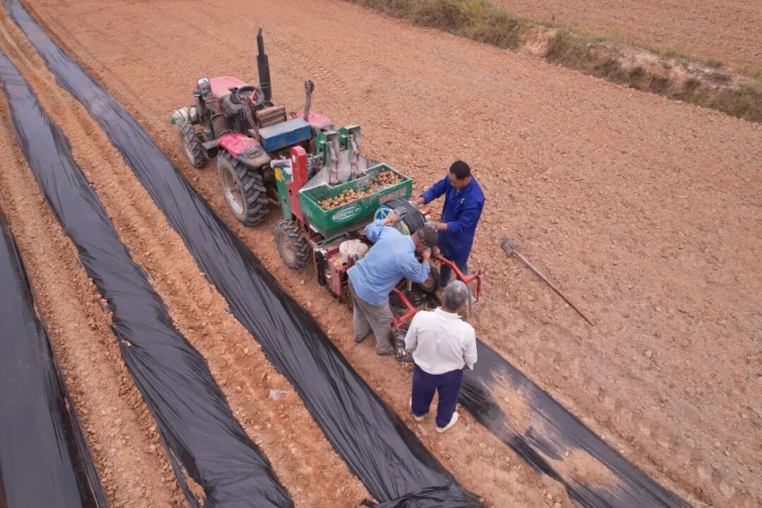 在古带村冬种现场,一台马铃薯专用种植机正在田间往来穿梭,三名操作员默契配合操控设备,一人操控方向、两人辅助整理薯种。种植机一边精准播撒薯种,一边快速覆盖地膜,同时将滴灌管道同步埋入土层,整套工序一气呵成。平南县东莱种植专业合作社在古带村利用冬闲田种植马铃薯500多亩,引入机械化种植与滴灌技术,大幅提升种植效率,更有效降低种植成本。