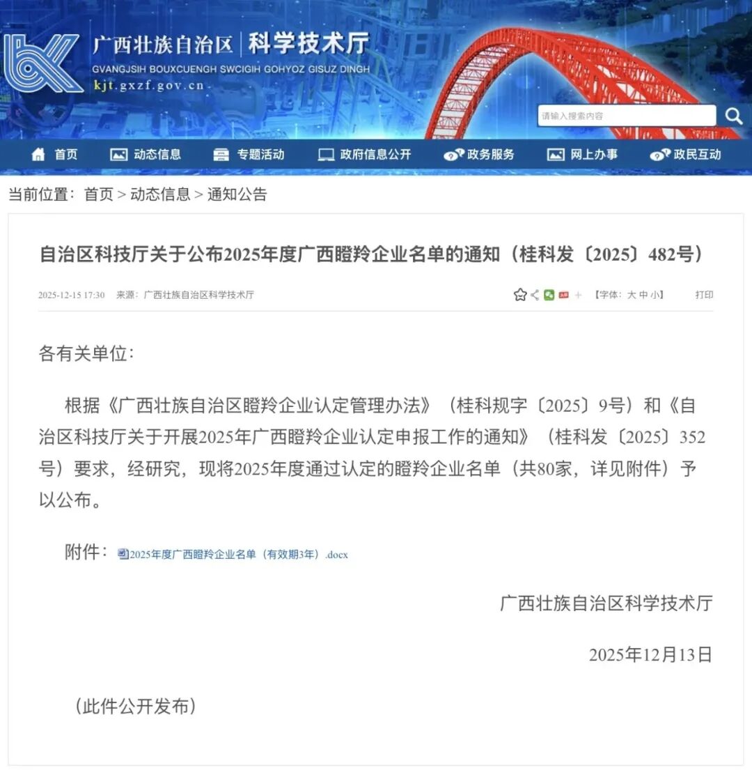 12月13日,广西壮族自治区科学技术厅公布2025年度广西瞪羚企业名单。其中,广西农垦西江乳业有限公司入选。